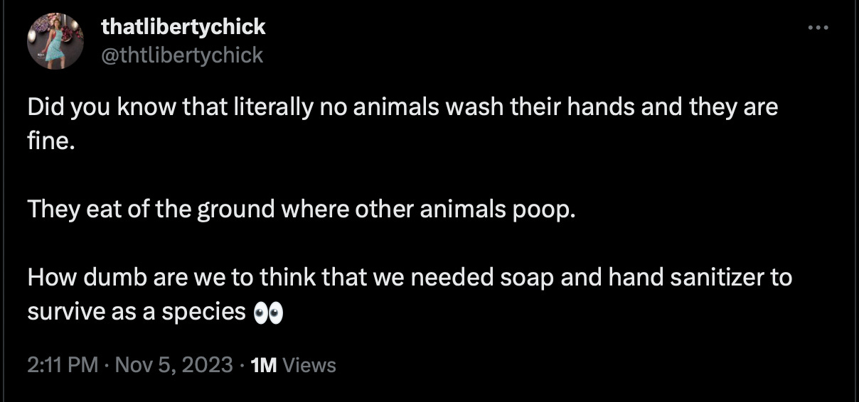 Germ theory is taking water now, too. It’s always had its detractors and outright deniers, of course (just as there have always been flat-earthers, I suppose). But not long ago they had to reel in converts through free newspapers at the co-op market or, if it came to it, in-person connections. I’m guessing, for the modal convert to germ-denialism, it was a long process involving some social cost and counterweighted by mainstream institutions and voices that made it harder. Now there are apps for this that will wrap you in a gauze of clip after clip “asking questions” and raising bogus statistics or just playing on normal cognitive vulnerabilities so thick that no lame boring normal voices telling you “it is important to wash your hands because germs are real, we’ve seen them just like pilots and astronauts have seen the curvature of the Earth” will get through. It’s a quick plunge with no net.